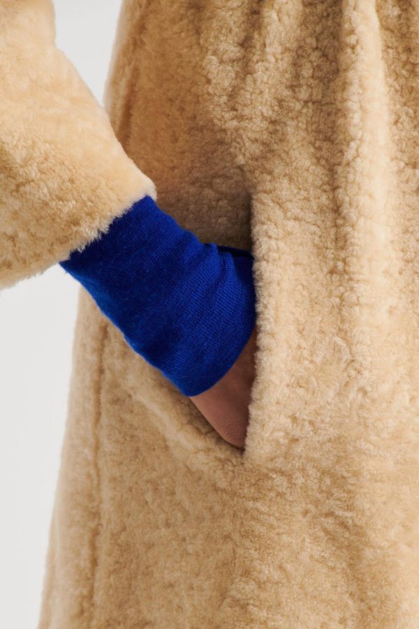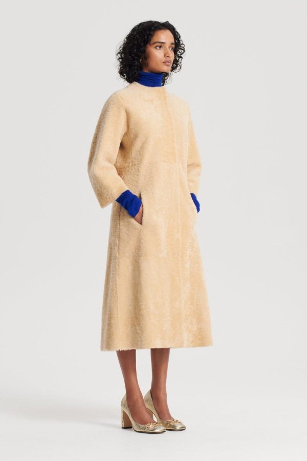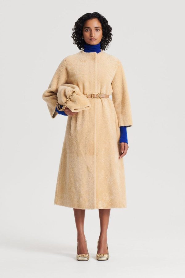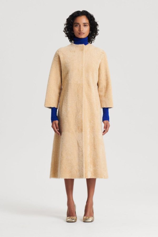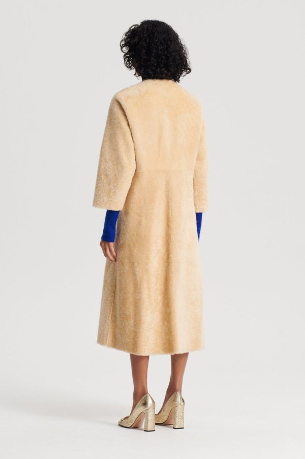 Indulge in this statement silhouette, the Cocoon Shearling Coat. Crafted from luxurious shearling, the enveloping silhouette that brings refined opulence to cold-weather ensembles. Falling below the knee, the collarless style features mid-length cocoon sleeves and dual side pockets. Layer over lightweight knitwear and style with a leather belt for added shape through the waist.
