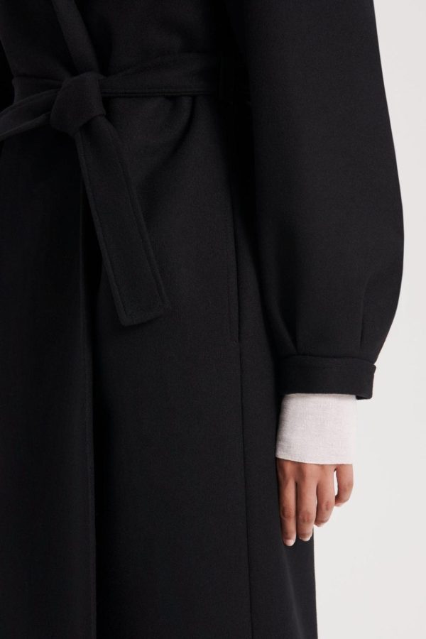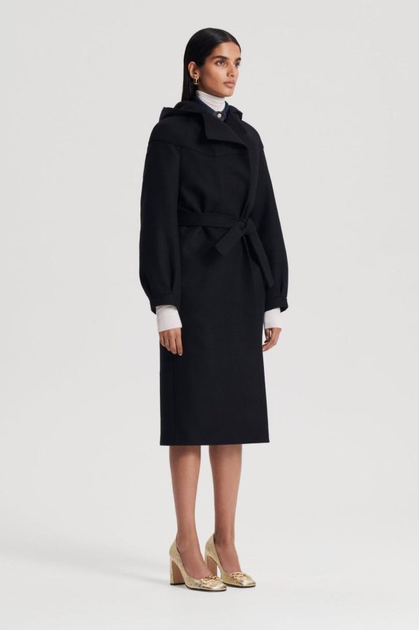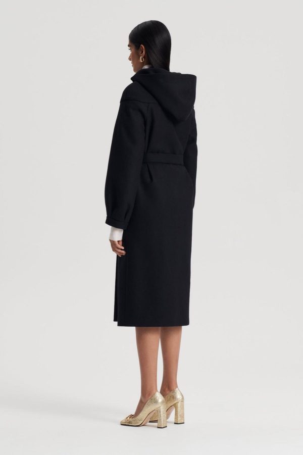 The Hooded Duffle fuses timeless design codes with refined detailing. Crafted from a soft wool blend, the relaxed silhouette features a high, wrap neck that can be styled as a wide v-neckline and open collar. Tailored to fall below the knee, the belted waist adds dimension to the enveloping silhouette. Pair over denim ensembles for a refined daily ensemble.