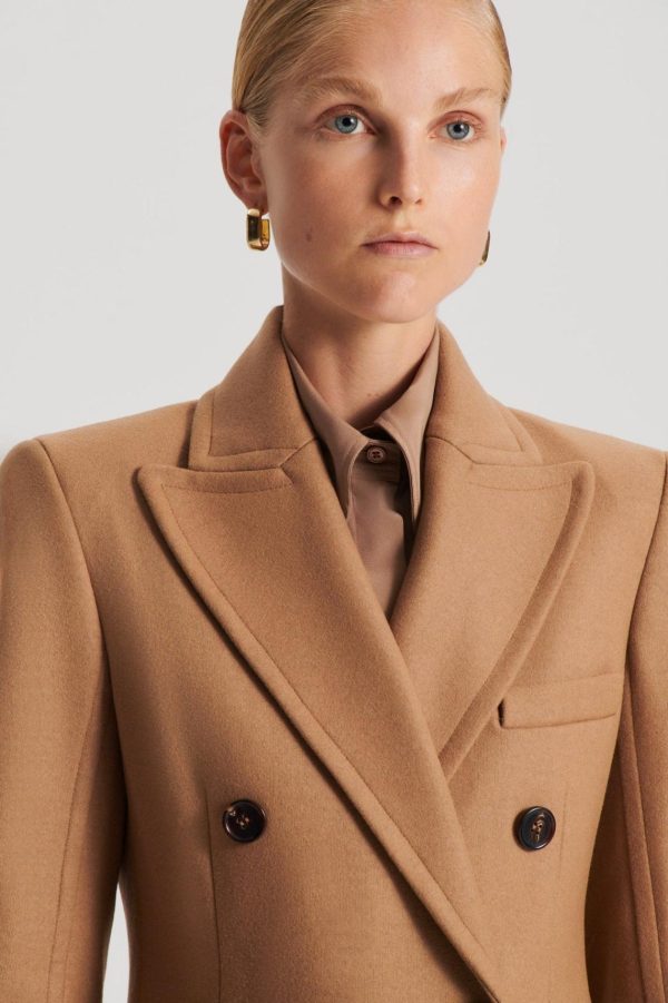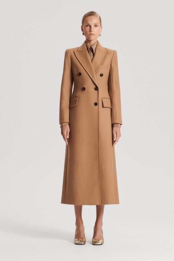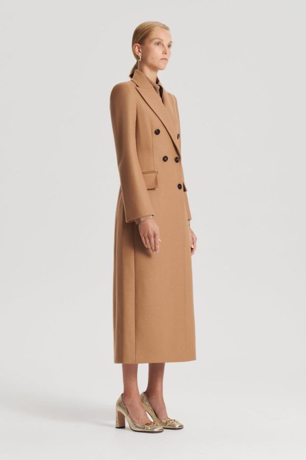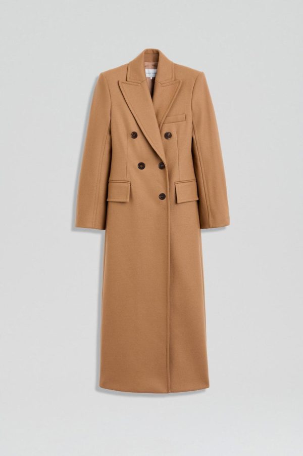 The Tailored Coat embodies timeless sophistication. The long line coat is characterized by the double-breasted silhouette, front button closure and peaked lapel. Complement the camel colorway by pairing with a tonal ensemble or layer over denim and leather pieces for refined elegance.
