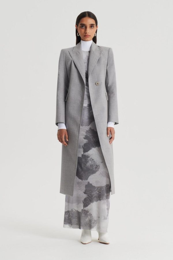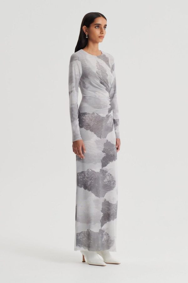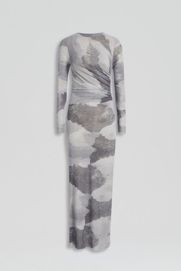 The Cloud Mesh Print Dress invites modern elegance to occasion silhouettes. Exclusively designed in-house as a hand-painted interpretation of cloud illustrations, the abstract motif is carefully printed in our Italian atelier on a high-quality mesh fabrication. Crafted to a minimalist silhouette, the dress is defined by the asymmetrical, gathered detailing down the side of the bodice. Pair with minimalist accessories and tailored outerwear for upcoming events.