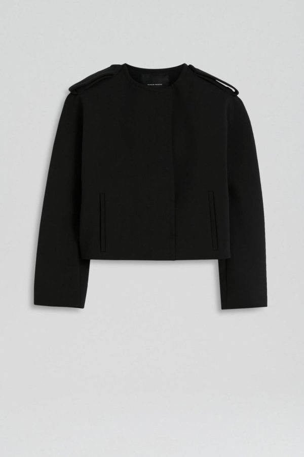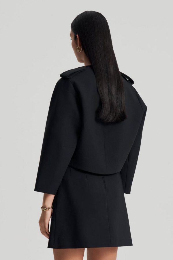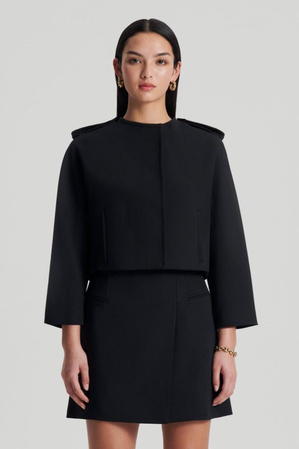 The Cady Cocoon Sleeve Jacket captures refined craftsmanship and elegant styling. Crafted in a black colourway, the collarless jacket is tailored to sit just above the waist. Showcasing voluminous cocoon sleeves, the elegant silhouette features epaulette shoulder detailing and off-centre zip closure. Pair with the coordinating skirt and refined accessories for a sophisticated ensemble.