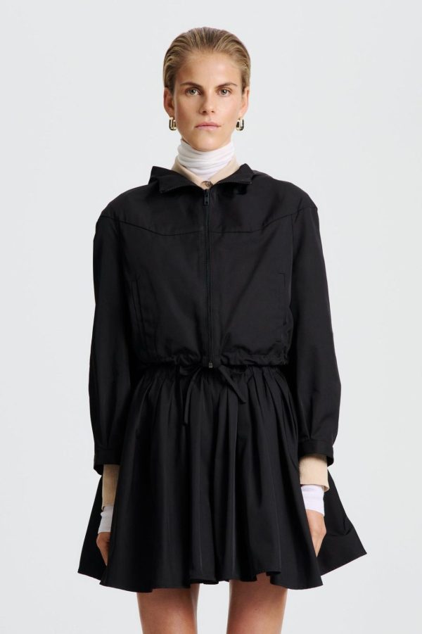 The Tech Bomber showcases a modern interpretation of outerwear. Crafted from black polyester, the cropped style is detailed with a drawcord waist, front zip closure and a hood. Style with the coordinating skirt and elevated knitwear layers for a transitional ensemble.
