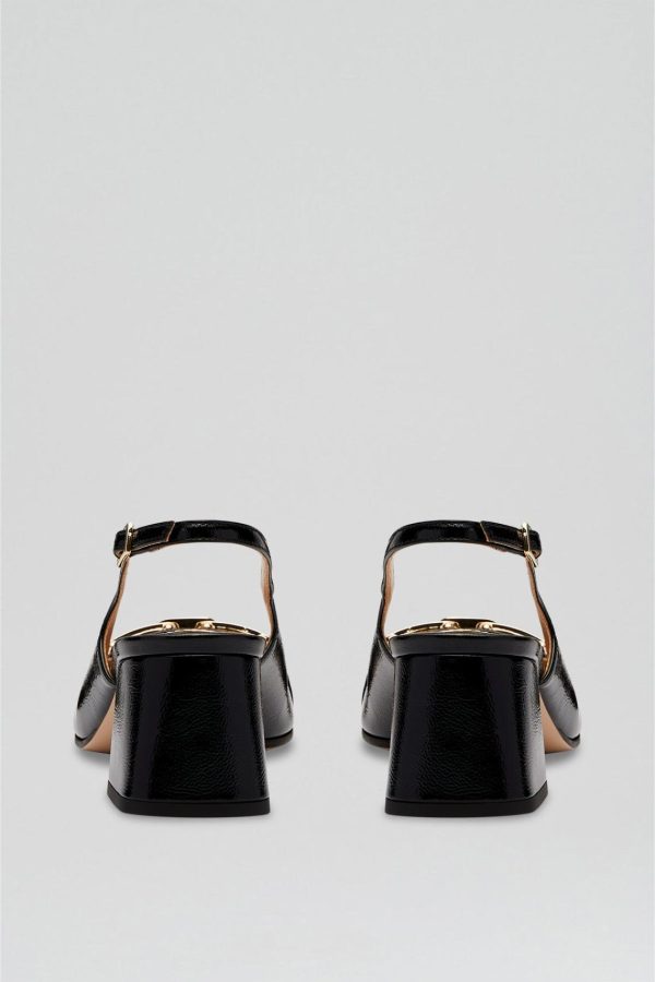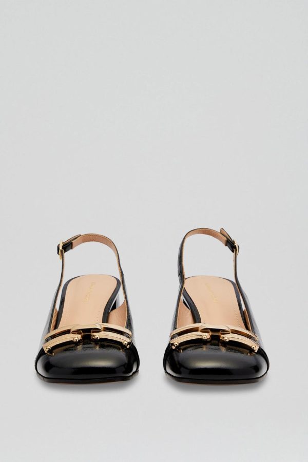The Gold Trim Slingback 5.5 in black is a classic silhouette imbued with refined modernity. Crafted from high gloss Italian leather, the squared toe silhouette features a heel strap with buckle fastening. Adorned with gold buckle detailing, the slingback is set atop a flared 5.5cm block heel. Pair with dresses or tailoring for sophisticated styling.