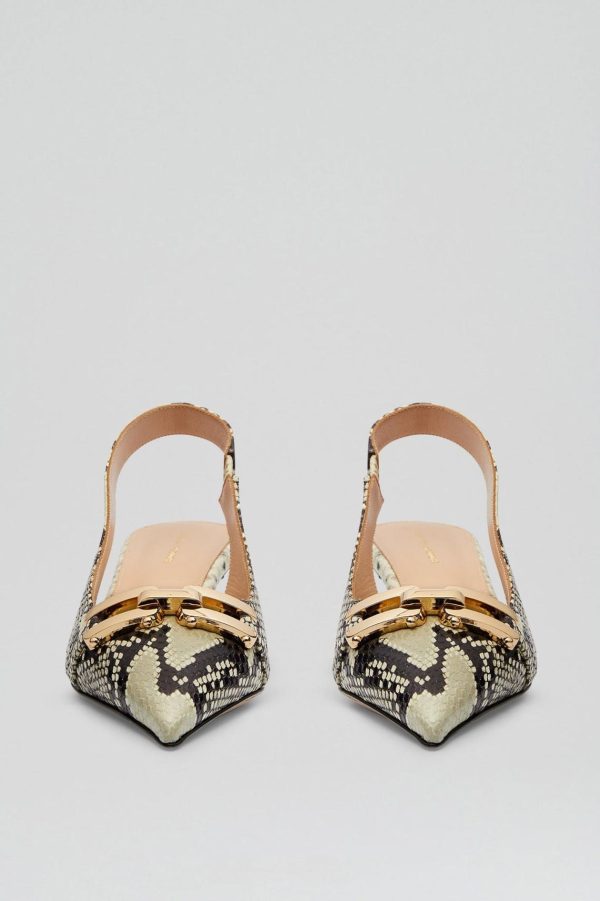 The Gold Trim Slingback interplays timeless elegance with contemporary detailing. Crafted from monochrome snakeskin embossed Italian leather, the slingback is set atop a 4.5cm kitten heel. Designed to a closed pointed toe silhouette featuring a heel strap with functional elastic, adorned with gold buckle detailing.