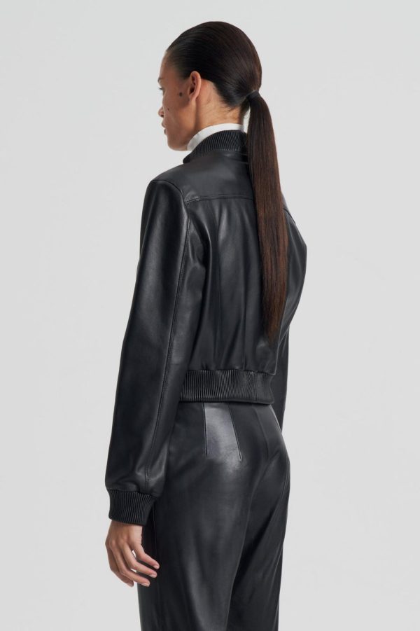 The Leather Bomber in black showcases Scanlan Theodore’s signature leather designs in renewed proportions. Crafted from 100% leather, the cropped style is inspired by vintage silhouettes. Detailed with elasticated trims and stitch panel accents, pair back with complementary leather pieces for indulgent styling.