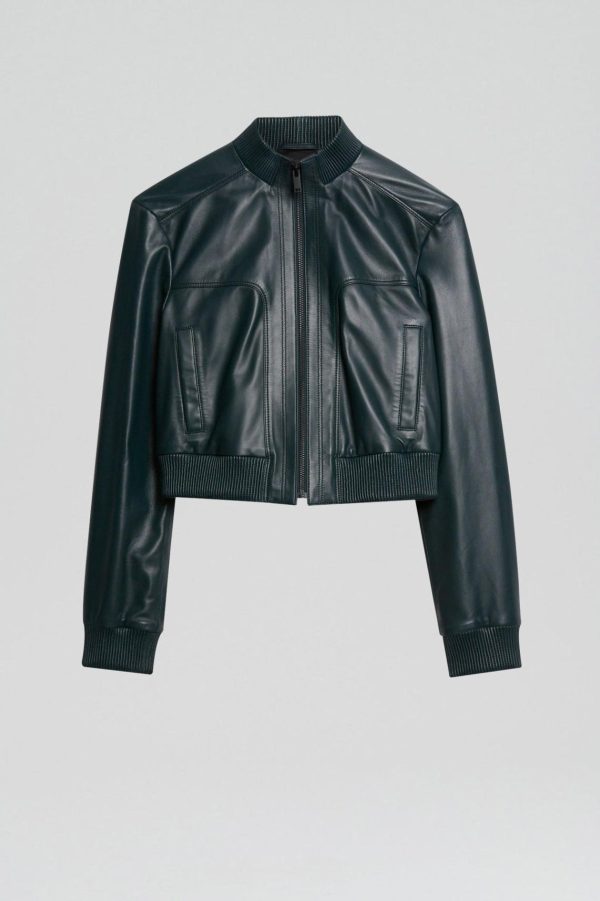 The Leather Bomber in dark green showcases Scanlan Theodore’s signature leather designs in renewed proportions. Crafted from 100% leather, the cropped style is inspired by vintage silhouettes. Detailed with elasticated trims and stitch panel accents, pair back with complementary leather pieces for indulgent styling.