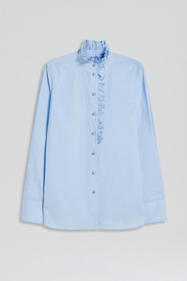 The Parachute Ruffle Trim Shirt interplays foundational dressing with feminine elegance. Tailored from 100% cotton in a light blue tone, the shirt showcases ruffle trim detailing around the neckline and along the button-up closure. Designed to work seamlessly into your wardrobe, the shirt effortlessly pairs with tailored trousers, leather or denim.