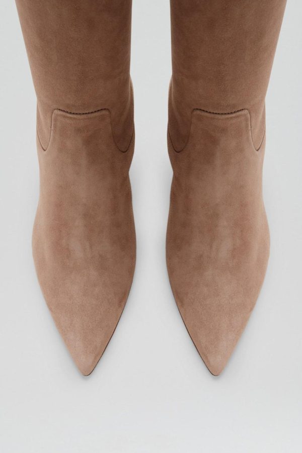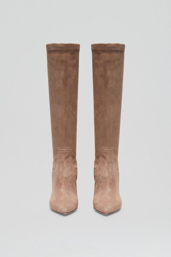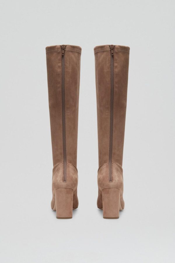 The Stretch Below The Knee Boot is a refined interpretation of Scanlan Theodore’s signature silhouette. Meticulously crafted from camel toned suede, the slim-fitting boot features a sophisticated pointed toe, block heel and back zip closure. Pair with dresses or denim for transeasonal styling.