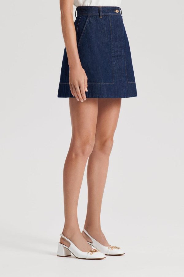 The Denim Mini Skirt in indigo is a contemporary, foundational wardrobe piece. Crafted from cotton with a flattering panel construction and front button closure. Pair with knitwear or elevated basics for a considered, daily ensemble.