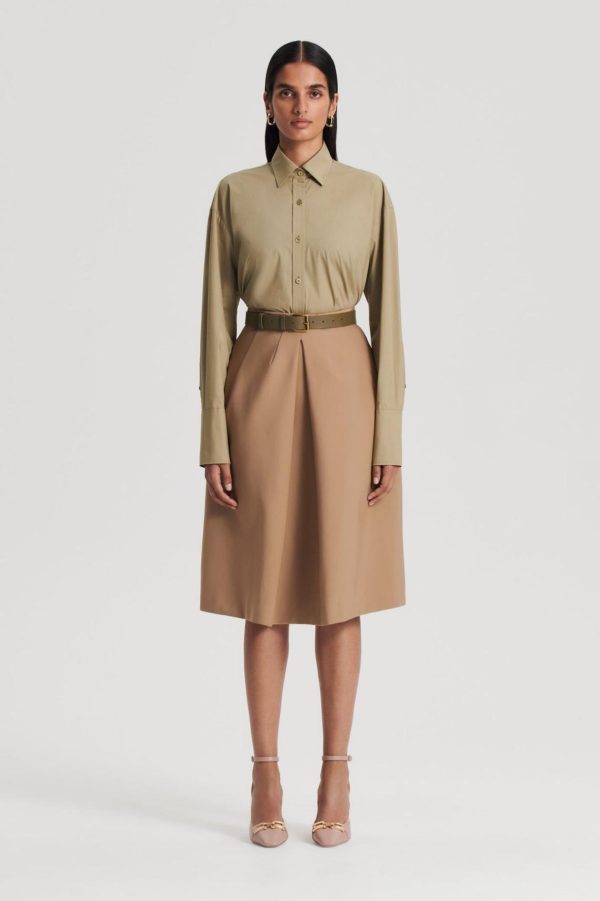 The Milano Pleat Skirt is imbued with refined elegance and modern minimalism. Crafted from Scanlan Theodore’s signature Italian tailoring fabrication in camel, the mid-length skirt is tailored to an a-line silhouette and features voluminous pleated detailing. Embrace the allure of occasion styling by pairing with an elegant blouse and sleek accessories.