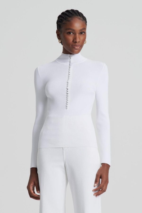 Capture classic silhouettes with contemporary embellishments in our Crepe Knit Button Polo Sweater. Crafted from our signature crepe knit fabrication, the slim-fitting polo features a flattering high neckline with long sleeves and front buttons for subtle detailing. Pair back with leather trousers for a sophisticated look.