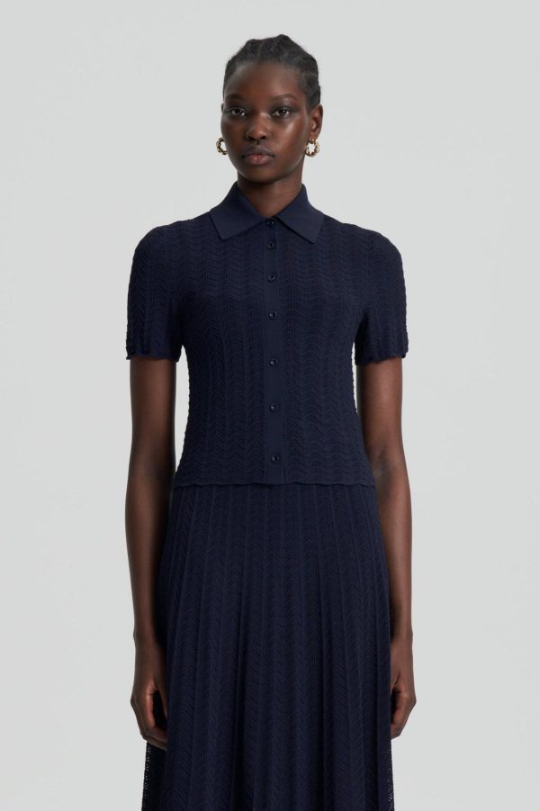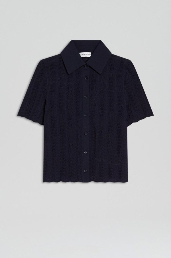 The Pleat Lace Shirt in navy embodies contemporary femininity. Knitted in a decorative scallop stitch to create a lace pattern design, the shirt is crafted to a cropped silhouette featuring classic shirting accents. Style with the coordinating skirt and accessories in complementary hues for an elegant ensemble.
