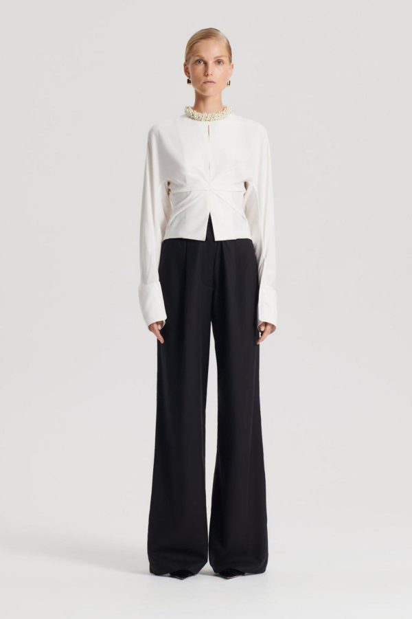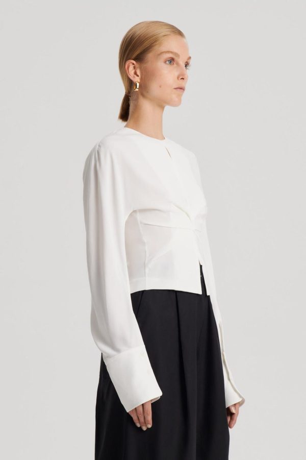 The Silk Satin Draped Top epitomises contemporary femininity. Crafted from lustrous silk blend, the blouse elegantly tailored to accentuate the waistline with intricate, draped detailing through the bodice. Detailed with a refined keyhole cut-out and front split hemline, the tailored silhouette is constructed by the billowing cocoon sleeves. Pair with tailoring and luxurious accessories for a contemporary approach to workwear.