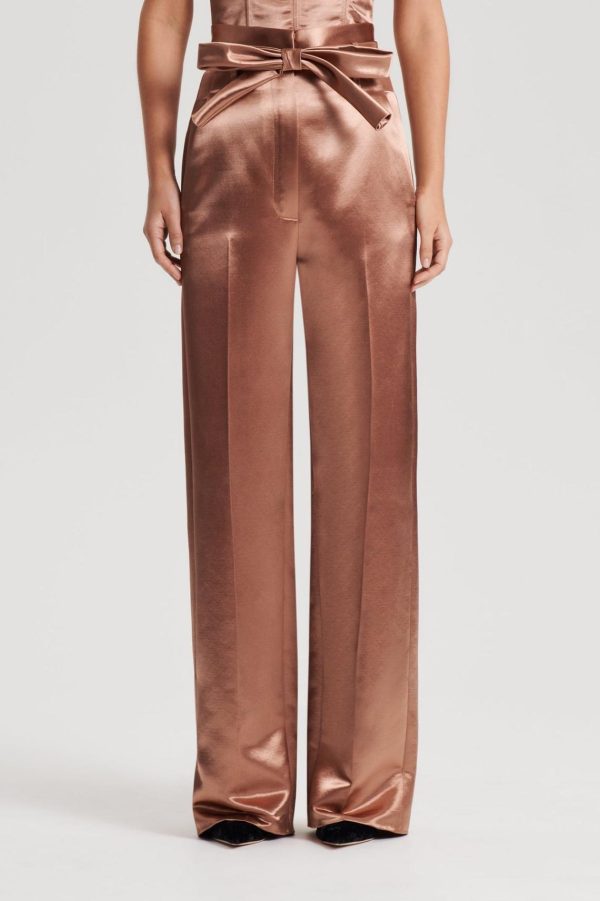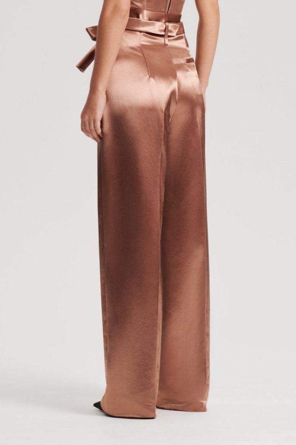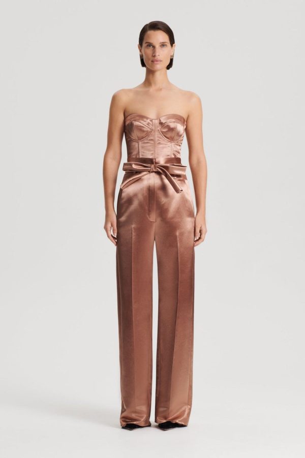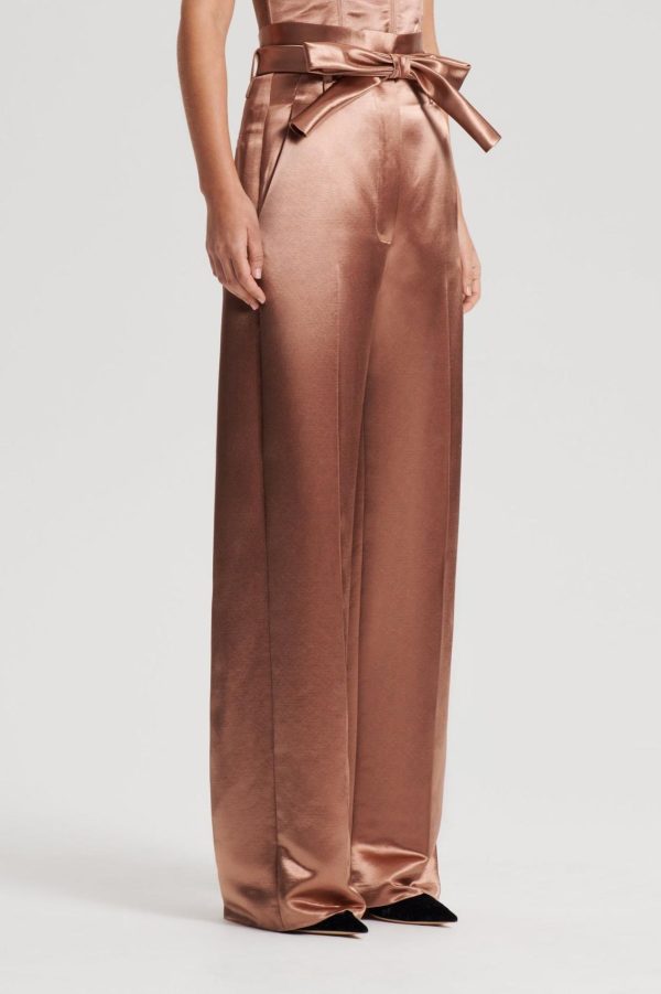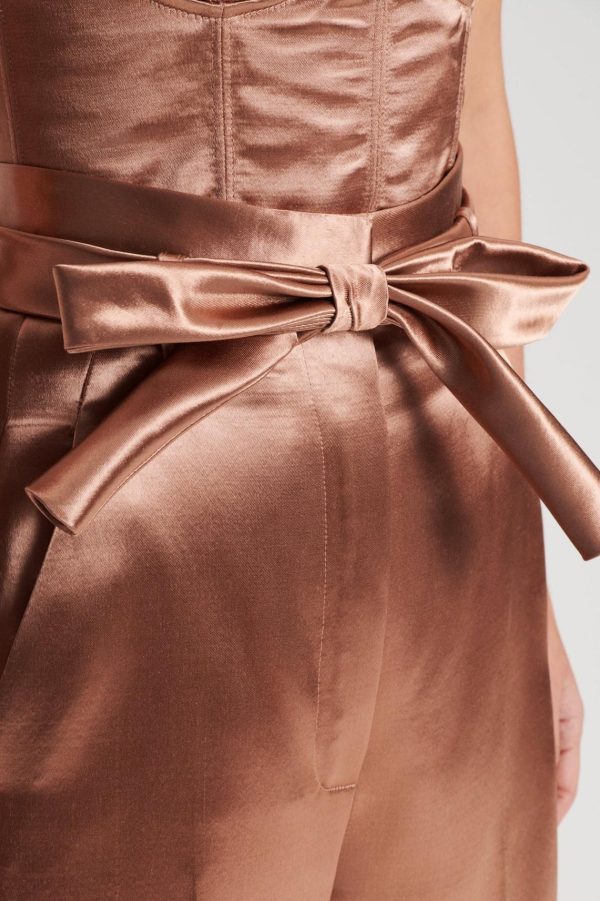 The French Satin Trouser is imbued with luminous sophistication. Crafted from a french wool and silk blend in a rich cinnamon hue, the trouser is tailored to a high-rise, relaxed silhouette with a paperbag waist. Pair with the coordinating bustier and sleek accessories for an alluring ensemble.