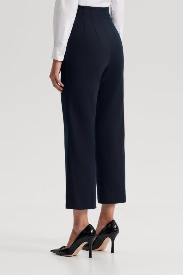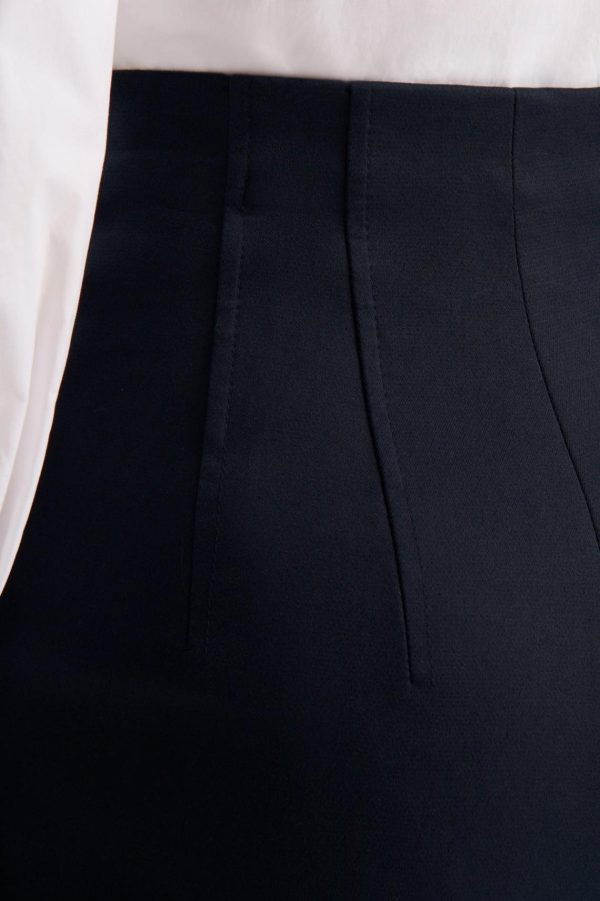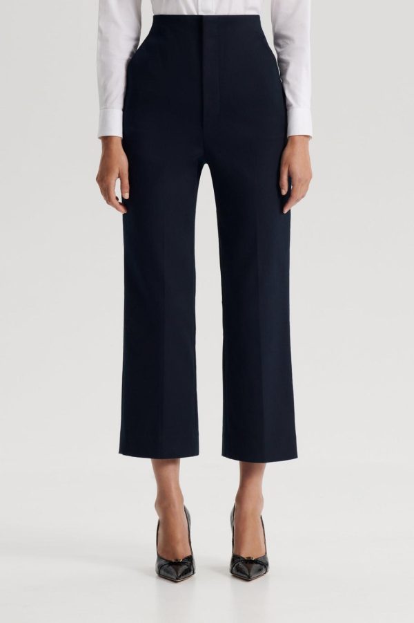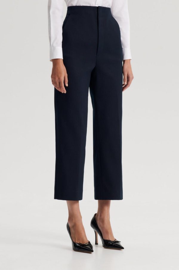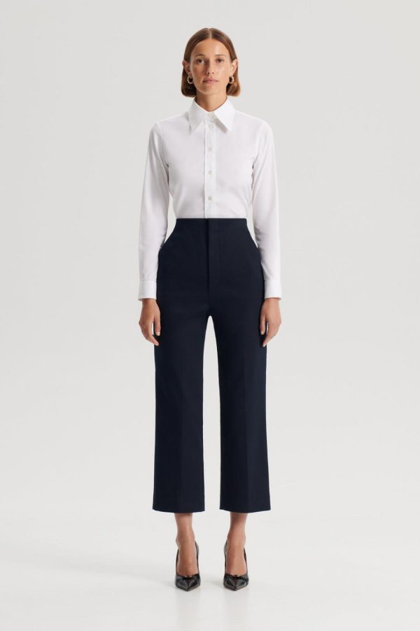 The Mercerised Cotton Trouser in navy interplays timeless tailoring and elegant silhouettes. Crafted from 100% cotton, the cropped trouser is tailored to a straight-leg silhouette. Pair back with lightweight knitwear, or crisp shirting and a tailored jacket for a modern approach to workwear.